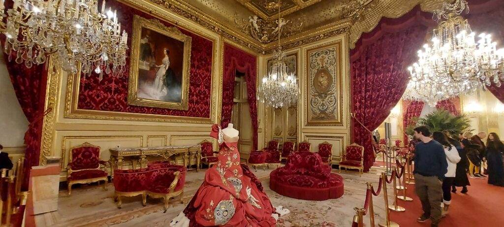 I also enjoyed goingto the former residence of Napoléon III – in the Richlieu wing. Looots of red damask and gold leaf, but I was there during Paris Fashion Week and there was an impressive exhibition of period-inspired luxury French fashion. While it worked well throughout the museum, I especially enjoyed it in these opulent halls.